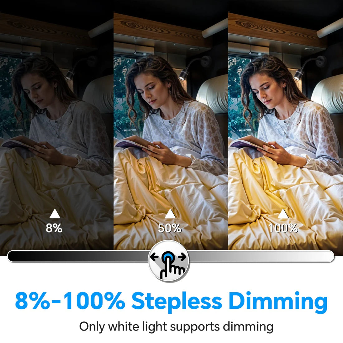 These lights are built for practical, everyday use in mobile living environments. The smooth dimming range offers precise control over brightness, while the optional red night mode provides a sleep-friendly alternative for late-night reading. The lightweight yet durable aluminium head and steel gooseneck ensure stable positioning, and the USB-C charging port eliminates clutter by replacing bulky chargers.