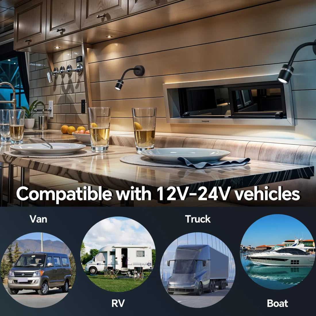 These Evo Reading Lights deliver modern style, fast device charging and highly adjustable lighting in one compact package. From late-night reading to soft cabin lighting, the dimming control, red night mode and flexible gooseneck make them an ideal upgrade for premium van builds, marine cabins and off-grid living spaces.