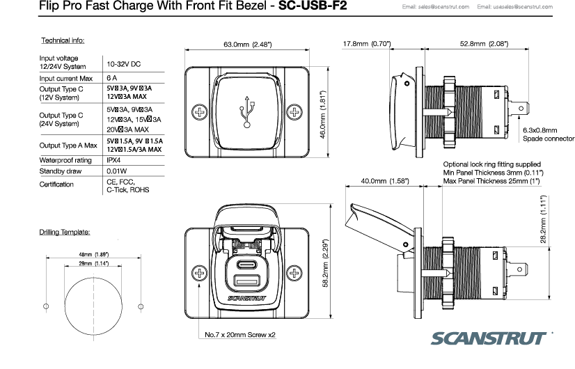 Flip Pro with front bezel is designed for use with either a 12V or 24V input and features 1x USB-A and 1x USB-C charging port. This provides the optimum choice of connection for any device and the fastest charging for your device onboard.